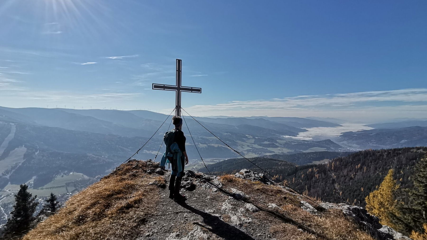 Nach zwei Stunden bin ich oben, was für ein herrlicher Platz. Am Gipfel der Kampalpe, einer vorgeschobenen Felskanzel – wie ein wunderbarer Aussichtsbalkon hoch über dem Mürztal – genieße ich den prächtigen Fernblick.(Titelbild)