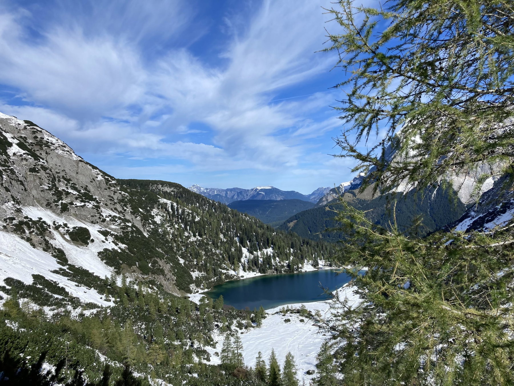 Jetzt holen wir auch die Grödel aus unseren Rucksäcken, da sie den Abstieg um ein Vielfaches vereinfachen und beschleunigen. Am Seebensee nehmen wir am nördlichen Ende den Wanderweg Richtung Ehrwalder Alm. Der Weg schlängelt sich entlang kleiner Hügel wunderschön über Almen und durch Wälder bis zur Bergstation der Seilbahn.