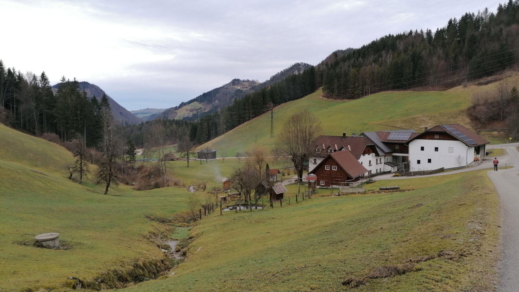 Ich gehe die Straße Richtung Südosten aus dem Ort hinaus, zu meiner Rechten der Gasthof Stubauer, vor dem ich den einzigen Menschen entdecke. Ins neue Jahr hineinwandern tun die Gaflenzer*innen offenbar nicht so gern, ich begegne bis zur Amstettner Hütte kaum jemanden.